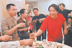 10日晚上,《还债》剧组举行了开机宴,由于高速公路起雾,牛群从北京赶到石家庄的时候已经是晚上8点钟。当牛群一脸疲惫地出现的时候,他那已经成为“摄影师、平民县长”标志的马甲并没有穿在身上,而只穿了件红色T恤和一件运动外套。让记者感到第二个变化的是牛群的话少了,开机宴上男主角牛群自然少不了讲话,人们满怀期待他能够讲出如相声般的精彩话语,可牛群只说了两句客套话便没了下文,在给各桌敬酒的时候他的话更少,只是端一下酒杯而不开口。