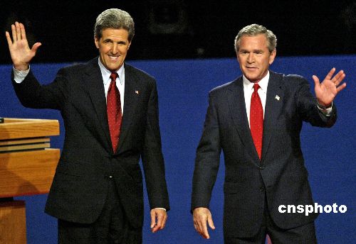 中新网10月14日电 美国总统候选人第三场辩论于美东时间13日晚9点在亚利桑那州立大学展开。由于是投票日前的最后一场辩论,布什与克里都将全力抓住这次给全国选民留下深刻印象、宣讲施政方针、全面攻击对方的最重要机会。