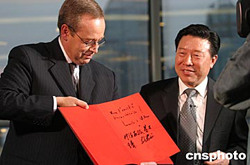 十月十四日,参加国际文化政策论坛第七届文化部长年会的法国文化部长德瓦布莱先生和中国文化部长孙家正在上海国际会议中心就中法共同举办文化年活动的影响展开专题讨论。中新社记者:廖文静