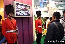 十月十四日,二零零四重庆秋季房地产展示交易会在重庆市展览中心开幕。此次房交会共有二百一十家单位参展,参展项目一百七十三个,面积达九百二十七万平方米。各商家在宣传上也是各出奇招,招徕看房者。图为一欧式楼盘展台边立着两名英国礼兵,吸引不少市民目光。作者:郭晋嘉
