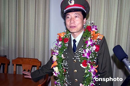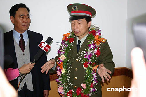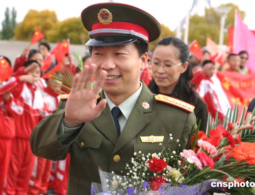 图为杨利伟抵达航天员公寓时受到热列欢迎。中新社记者:孙自法