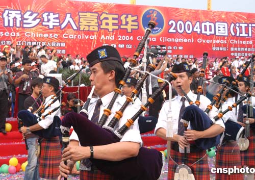 中新社江门十月十七日电(记者邢利宇)今天上午,彩旗、彩球、花车、巡游表演队把广东江门市东湖广场装扮一新,来自世界各地的华侨华人、港澳同胞及内地各界嘉宾两千多人欢聚于此,“中国(江门)侨乡华人嘉年华暨二OO四中国(江门)侨乡旅游节”在热烈的气氛中隆重开幕。