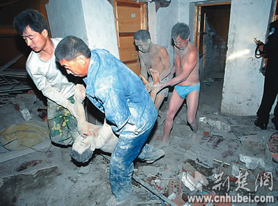 报道称,工棚内住有民工23人,早已熄灯睡觉。巨响之后,工棚内立即传出呼救声。未被砸中的工人浑身是灰逃出来后,又折转身去救人。因工棚配电箱被砸,他们摸黑搜索,搬开瓦砾救人,先后用双手刨出5名工友。