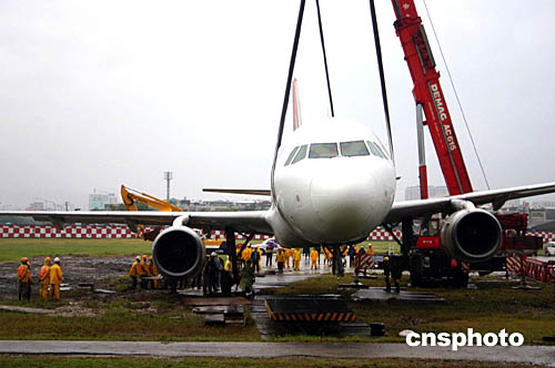此间电视台报道,这架载有九十人的A-320飞机原计划晚八点在松山机场降落,由于天雨跑道湿滑,加上侧风,出现失控,险些撞到机场围墙。驾驶员紧急左转,因而飞机冲出跑道。从电视画面上看,飞机前轮似有损坏,机头微朝下。