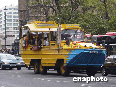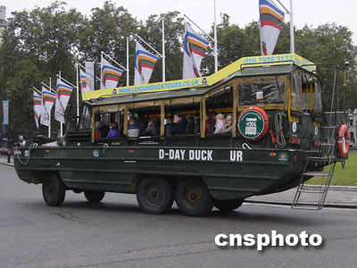 伦敦街头造型模仿诺曼底战役盟军登陆舰的观光大巴。余瑞冬 摄