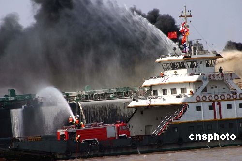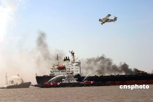 抢救落水人员的工作刚完成,失事油船突然爆炸起火,现场施救指挥中心紧急调派载有消防车的消防拖轮到达现场,对起火油轮进行灭火。长江不仅是重要的运输通道,更是重要的饮用水源。在演习现场周围,清污船开始向江中喷射消防泡沫,在江面聚积的泡沫可以对爆炸油轮喷洒出来的油污进行有效地清除,最大限度的降低对江水的污染。