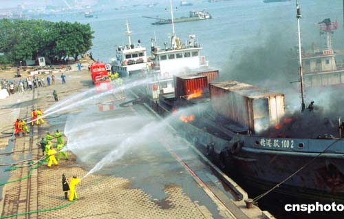 二十日下午三时,广州港警方首次演练扑救装载危险品集装箱船只爆炸事故。图为消防员手拿灭火器向起火的集装箱船只喷射泡沫。作者:梁伟成
