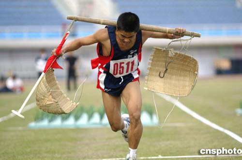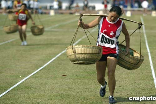 具有浓郁农村特色的挑搬粮食比赛成为赛场上亮点,参赛选手在比赛中不仅要有速度,还要有力量和平衡感。图为女子八十米挑搬粮食比赛。中新社记者:盛佳鹏