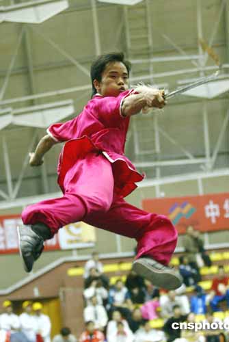 在男子剑术的比赛中,精彩场面不断,图为一名参赛选手在比赛中凌空攻击,如同小说中的侠客。中新社记者:盛佳鹏