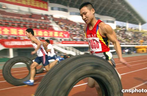特色十足的一百米推轮胎比赛将速度与技巧结合在一起,成为赛场上的一个亮点。图为参赛选手在男子一百米推轮胎比赛中奋勇争先。中新社记者:盛佳鹏