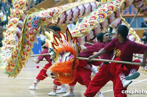 在舞龙比赛自选套路的比赛中,贵州队表演了高难度舞龙动作。中新社记者:盛佳鹏