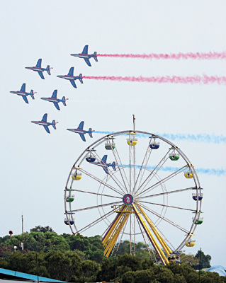 担任特技表演的八架阿尔法战机,在港岛海面上空排列出菱形、雁行、箭形及十字形等不同队型,并不断做出空中翻跟斗、急转弯、突然分散及对飞等被人形容为“空中芭蕾”的连串高难度花式表演动作。表演中飞机尾部喷洒出象征法国国旗的红、白、蓝三种彩色烟雾,在空中形成美丽的图画。约半个小时的精彩特技飞行引得香江观众阵阵欢呼和赞叹。