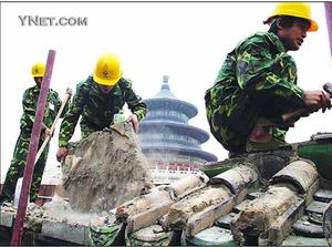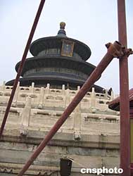 中新网10月21日电 北京娱乐信报报道,天坛祈年殿昨天开工大修,此举也拉开了北京世界遗产大规模修缮的帷幕。据悉,本次大修投资2000多万元,是今年北京市投资最大的文物修缮项目。