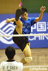在毽球比赛中,精彩场面不断呈现。图为男子单打比赛中四川参赛选手跃起进攻。作者:盛佳鹏