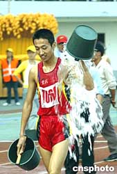 五分钟五十米抗旱提水保苗赛跑成为一个特色的比赛项目,同时也是和农民生活非常接近的一个比赛项目,要求参赛选手在规定的时间内尽可能多的提水。图为一位顺利完成比赛的选手将水桶里的水倒在身上庆祝。作者:盛佳鹏