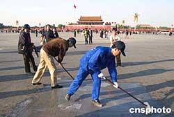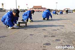 10月23日,清洁工人正在北京天安门广场对已经发黑的花岗岩地面进行清洗。清洗工作完成后,广场地面将恢复淡粉色原貌。清洗工作原计划在十天内完成,但由于污渍太多,加上清理口香糖等污渍难度大,估计此次广场大“洗脸”将会延期完成。作者:张炜