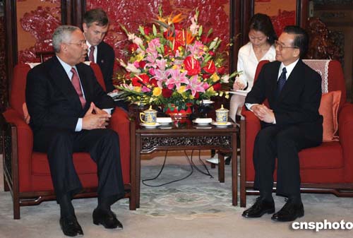鲍威尔表示,很高兴再次访问北京。他对温家宝访问美国记忆犹新。在那次访问期间,布什总统重新确认了一个中国的政策。