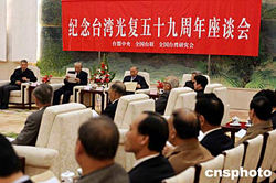 台盟中央、全国台联、全国台湾研究会十月二十五日在北京人民大会堂举行座谈会,纪念台湾光复五十九周年。中新社记者:毛建军