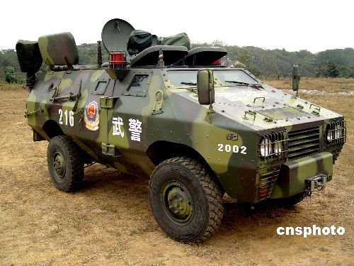 2004年10月25日,在武警某部训练场,新型防暴运兵车和防暴装甲车与武警“反恐”队员配合,共同实施“反恐”演练。该型防暴车为中国自行生产,使用防弹钢板制造,可有效预防7.62MM钢心弹射击,撞击24CM厚砖墙,爬坡31度;轮胎内带有进口防爆液,在中弹瞬间能迅速封堵并继续行驶50KM。该型防暴车最高时速可达100KM/H,所配备10M超短波天线能在2500KM内接收短波信号。作者:王耀武