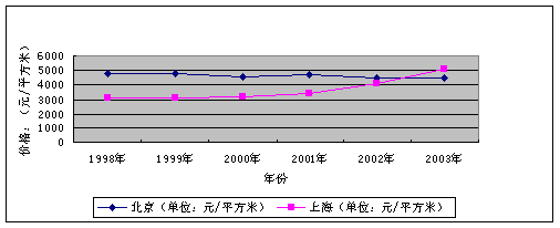 但从动态上看,商品房空置面积并没有增加,而是呈下降趋势。2004年8月底,商品房空置面积0.97亿平方米,同比减少0.8%,比去年底减少3%。这说明当前的房地产空置问题并未恶化。我们认为,对于房地产空置现象,必须从两个方面认识:一方面,房地产空置占压大量资金,其中部分形成不良资产;另一方面,一定规模的空置对正常的房地产市场是完全必要的,它实际上在某种意义上是一种“库存”,从而发挥平抑房价的作用。从图3的对比可以看出,上海市近几年房地产供销两旺,不仅没有出现大量空置,连部分以前积压的房子也卖出去了,而房价表现为一路飙升;北京市则房价比较稳定,甚至稳中有降,其中房地产空置对房价上升起到的抑制作用不可忽视。