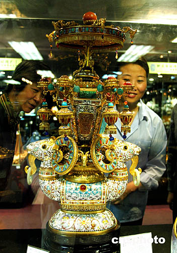 北京市特级工艺美术大师张同禄制作的“吉羊宝灯”格外引人注目。这件作品镶嵌有宝石、玉石和玛瑙等三百余颗,采用景泰蓝与玉器、花丝镶嵌等多种工艺结合而成,曾在今年法国巴黎万国博览会上获得特别大奖。