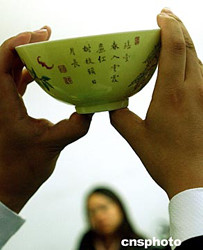 北京华辰十一月秋季将拍卖一件最高品级的清雍正黄地珐琅彩题诗碗,堪称收藏界麟角难觅之器,自今难以估价。中新社记者:贾国荣