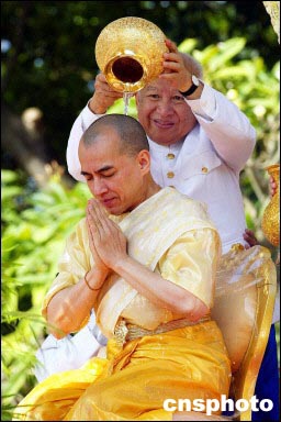 10月29日,在柬埔寨金边王宫,柬埔寨前国王诺罗敦·西哈努克向其子、新国王诺罗敦·西哈莫尼浇圣水。