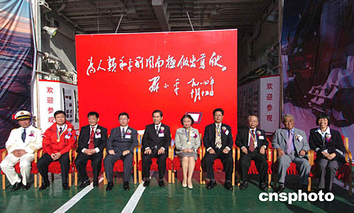 香港律政司司长梁爱诗等嘉宾登上“雪龙号”破冰船﹐并在邓小平题词下合影。