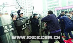 20余人聚集在某市市政府前“闹事”,110民警迅速赶到现场设立警戒线,阻止“闹事者”的前进。但情绪激动的“闹事者”很快便冲破了第一道防线,开始殴打民警。接报赶到的防暴大队特警手持防暴盾牌进行拦截,设置了第二道防线。为了迅速平息大规模的“骚乱事件”,上级命令使用催泪弹等对“闹事人群”进行驱散。几颗催泪弹丢在地上,散出滚滚浓烟。当特警采取防暴队形围捕了为首的“闹事者”后,其余人便立即作鸟兽散去,“危机”终于化解。