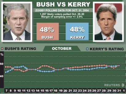 而路透/佐格比(Zogby)上周日公布的最新民调显示,布什和克里再度打成平手。布什和克里在这项三天的全国追踪民调中,均获得48%的支持率,三天当中有一天是在播出奥萨马录影带后进行调查。此前,克里在上周六的调查中以47%比46%,领先布什1个百分点。目前只有2%的选民尚未做出最后决定。