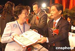 中国侨联主席林兆枢(图右一)、福建省委代书记、省长卢展工(图中)、福建省侨联主席李欲晞等十一月二日出席福建省侨联成立四十五周年纪念大会并为海外及港澳顾问颁发聘书。作者:刘可耕