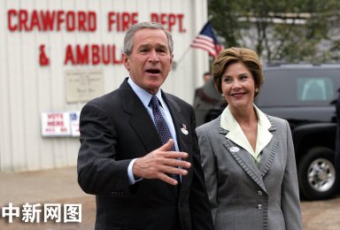 11月2日,美国总统布什与第一夫人劳拉在德克萨斯州的克劳福德投票后,向新闻界发表讲话。