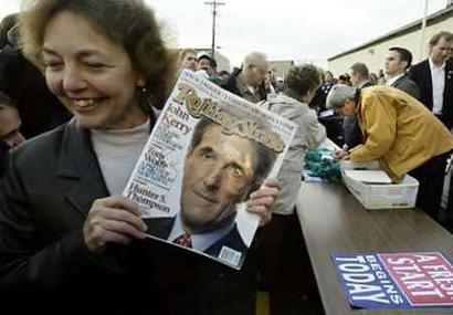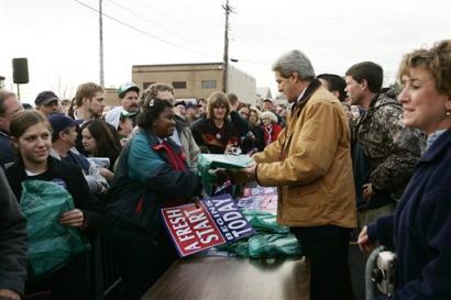 图为2日当天克里在威斯康星州分发竞选宣传材料的一个场景,克里的一名女支持者手里拿着的杂志,是民主党总统候选人克里签过名了的一本竞选宣传资料。(固山)