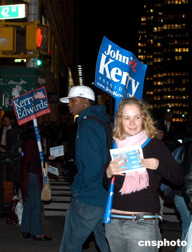 当地时间十一月二日,美国进行总统大选。当天晚上距离纽约州投票结束还有三个小时的时候,克里的支持者还锲而不舍地在纽约时代广场派发传单,呼吁选民投票给克里。作者:赵海燕
