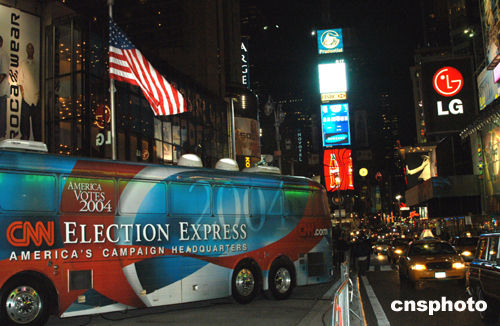 当地时间十一月二日,美国进行总统大选。美国有线新闻网(CNN)将“大选快车”开进纽约时代广场。作者:赵海燕