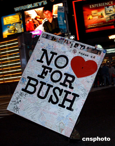 当地时间十一月二日,美国进行总统大选。当天晚上距离纽约州投票结束还有三个小时的时候,一个小伙子搬着一幅巨大的反布什标语牌出现在纽约时代广场。作者:赵海燕