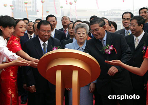 图为中国国务院副总理吴仪、柬埔寨首相洪森和老挝总理本扬等,在开幕式上共同启动世纪时钟。