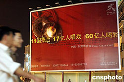 十一月二日夜,两位市民走过广西自治区首府南宁街头的巨幅中国-东盟博览会宣传画。十一月三日,由中国和东盟十一国搭台、十七亿人唱戏、全球六十亿人喝彩的首届中国-东盟博览会在广西南宁举行,将有两万多名海内外宾客出席这一盛会。中新社记者:武仲林