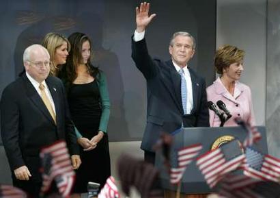 中新网11月4日电 据CNN消息,北京时间11月4日凌晨4时(美国东部11月3日下午15时),获得总统大选胜利的美国现任总统布什和副总统切尼发表演讲。切尼在简短的发言后便请出了布什。
