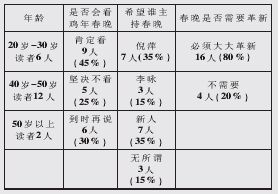 在“最喜欢的演员”中,赵本山、宋丹丹独占鳌头,获得半数以上读者推荐;而“最不喜欢的演员”中,陈佩斯则遭到4位观众的“弹劾”。在节目上,12位读者认为小品、相声应该加强,歌舞应该减少,8位读者表示节目时间太长。