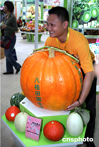 十一月三日到六日在广西南宁开幕的首届中国—东盟博览会上,一名参观者在广西农业展厅里的巨型南瓜前留影。本届博览会参展商品涉及机械、家电、电子信息、汽车及配件、五金建材、农产品、医药化工、轻工等十一个行业共二百多类产品。中新社记者:武仲林