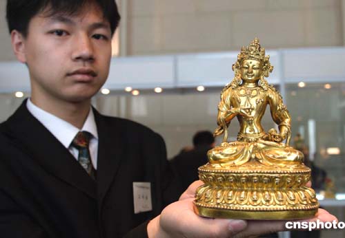 “尊崇之美——佛像艺术专场拍卖会”十一月六日在北京举行。由中国嘉德拍卖公司举槌的这场佛像拍卖会是北京首次举办的大规模佛像拍卖会,共成交一千二百余万元人民币,多尊珍贵佛像以高出底价数十万元的价格成交。作者:张炜