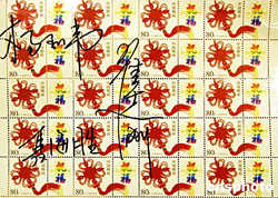由中国航天第一人杨利伟及飞天预选航天员聂海胜、瞿志刚亲笔签名,并随“神州五号”一起遨游太空的《神五搭载纪念邮票》,十一月九日亮相申城。图为该邮票三个整版之一的同心结版。作者:汤彦俊