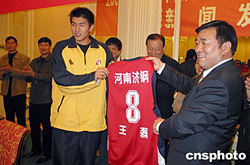 十一月九日,河南男篮队员在展示他们新球衣。2004-2005CBA联赛将拉开战幕,河南男篮首次挤身这个中国最高水平篮球联赛。作为CBA中的新成员,河南仁和男篮重新冠名,请来前南斯拉夫国家队助理教练莱克·特罗曼担任河南男篮的主教练。作者:慎重