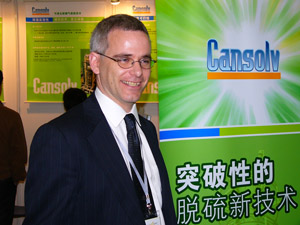 在展会上,加拿大康世富科技环保有限公司是国际上少数拥有成熟脱硫脱硝技术企业之一。该公司副总裁柯林·莱恩先生说,“康世富来了世界领先的可再生胺液脱硫技术,希望康世富技术能为中国的酸雨防治和绿色GDP助一臂之力”。他表示,与目前通用的石灰石-石膏法相比,康世富技术具有脱硫效率高(99%以上)、投资合理、综合运营成本低、占地少、节水节能、脱硫胺液可循环使用7至10年、无二次污染等优点。他相信,这个技术进入中国后,很快能找到合作伙伴。
