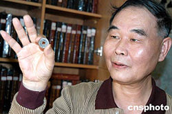 福建省收藏文化研究会名誉会长、福建钱币收藏第一人欣士敏,十一月十日在福州首次向外界展示一枚清康熙二十七年(公元一六八八年)台湾钱局铸造发行的珍稀钱币。这枚背面写有满、汉文“台”字字样的“康熙通宝”钱币是三百多年前清政府统一台湾、设置台湾府的历史见证。作者:刘可耕