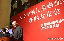 十一月十日晚,美国国际儿童癌症治疗(中国)联合委员会主席威廉.牛顿教授在北京贵宾楼饭店“关心中国儿童癌症基金”举办的新闻发布会上宣布:美国国际儿童癌症治疗(中国)联合委员会将与北京儿童医院合作,推出一系列公益资助计划,联手救助中国白血病患儿。中新社记者:史利