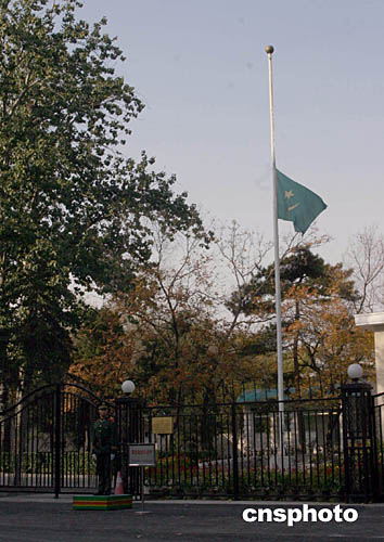 十一月十一日下午,北京的毛里塔尼亚伊斯兰共和国驻华使馆降下半旗,向当天去世的巴勒斯坦民族权力机构主席阿拉法特致哀。中新社记者:史利