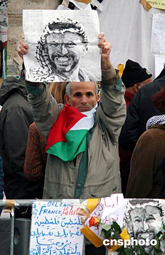 图为10日傍晚赶到的叙利亚裔的哈桑,在守侯一整夜并得知阿拉法特去世的消息后,高举画像为自己心目中的英雄送行。