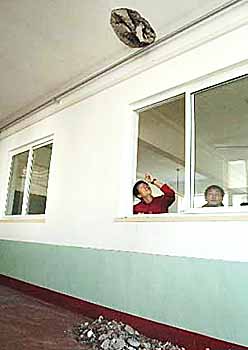 昨日上午10时05分,大连第四十四中学教学楼三楼走廊突然传来“轰”的一声响,跑到三楼走廊查看情况的几名教师被眼前的一幕惊呆了:教学楼坚固的水泥板楼顶突然出现了一个直径约30厘米的大洞,地上散落着水泥碎块,在碎块中,还有一块约20厘米长的金属杆,老师们的第一反应是——“不明飞行物”击中教学楼。随后,一位老师报警。